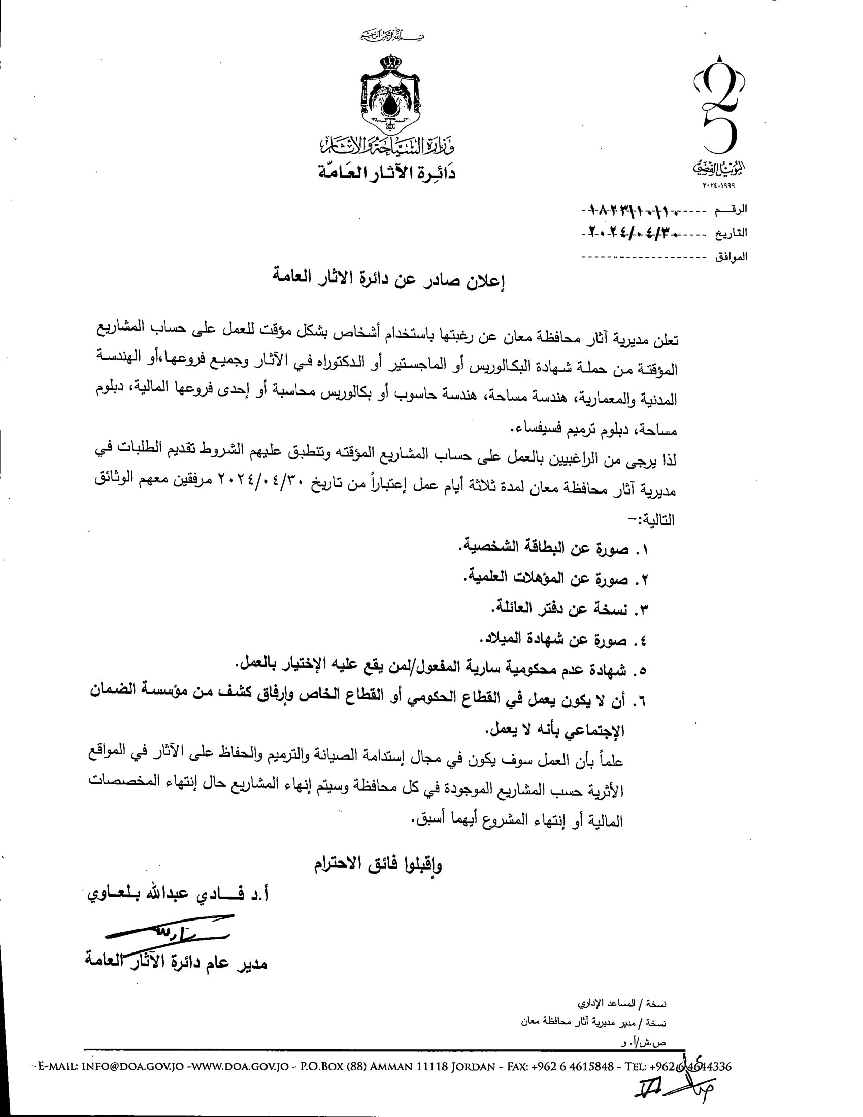 إعلان تشغيل لحساب المشاريع المؤقتة -مديرية اثار محافظة معان