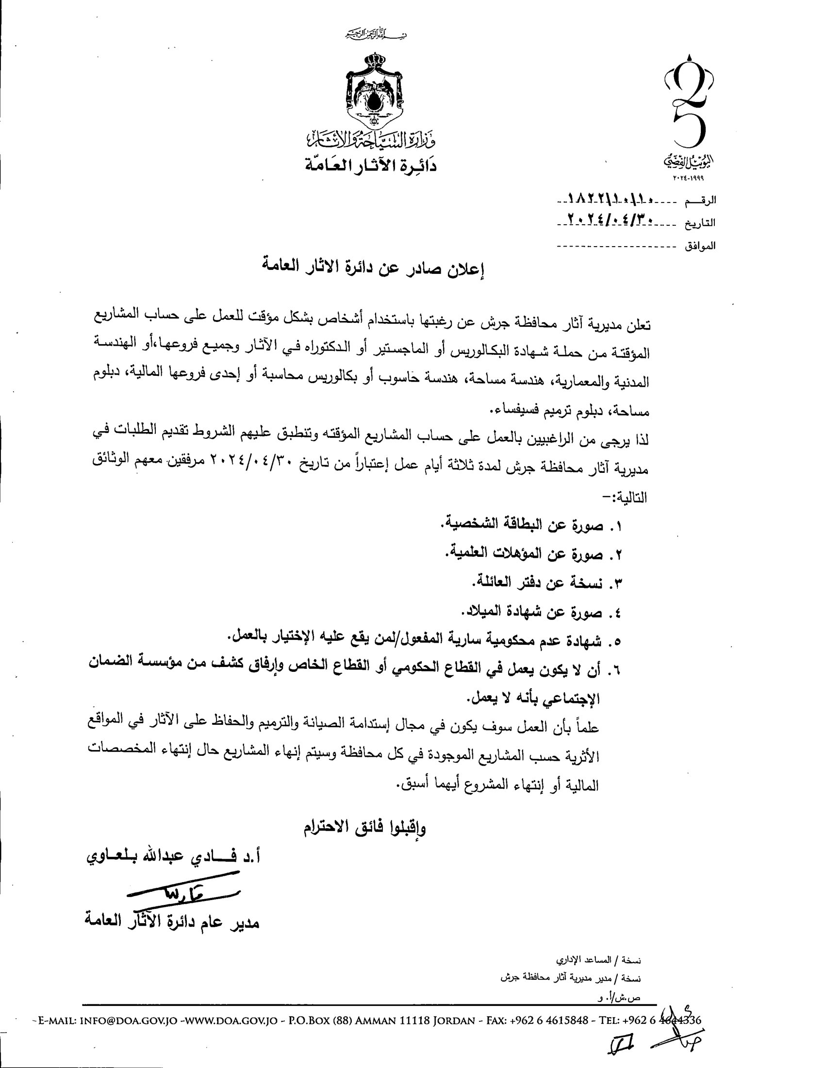 إعلان تشغيل لحساب المشاريع المؤقتة -مديرية اثار محافظة جرش