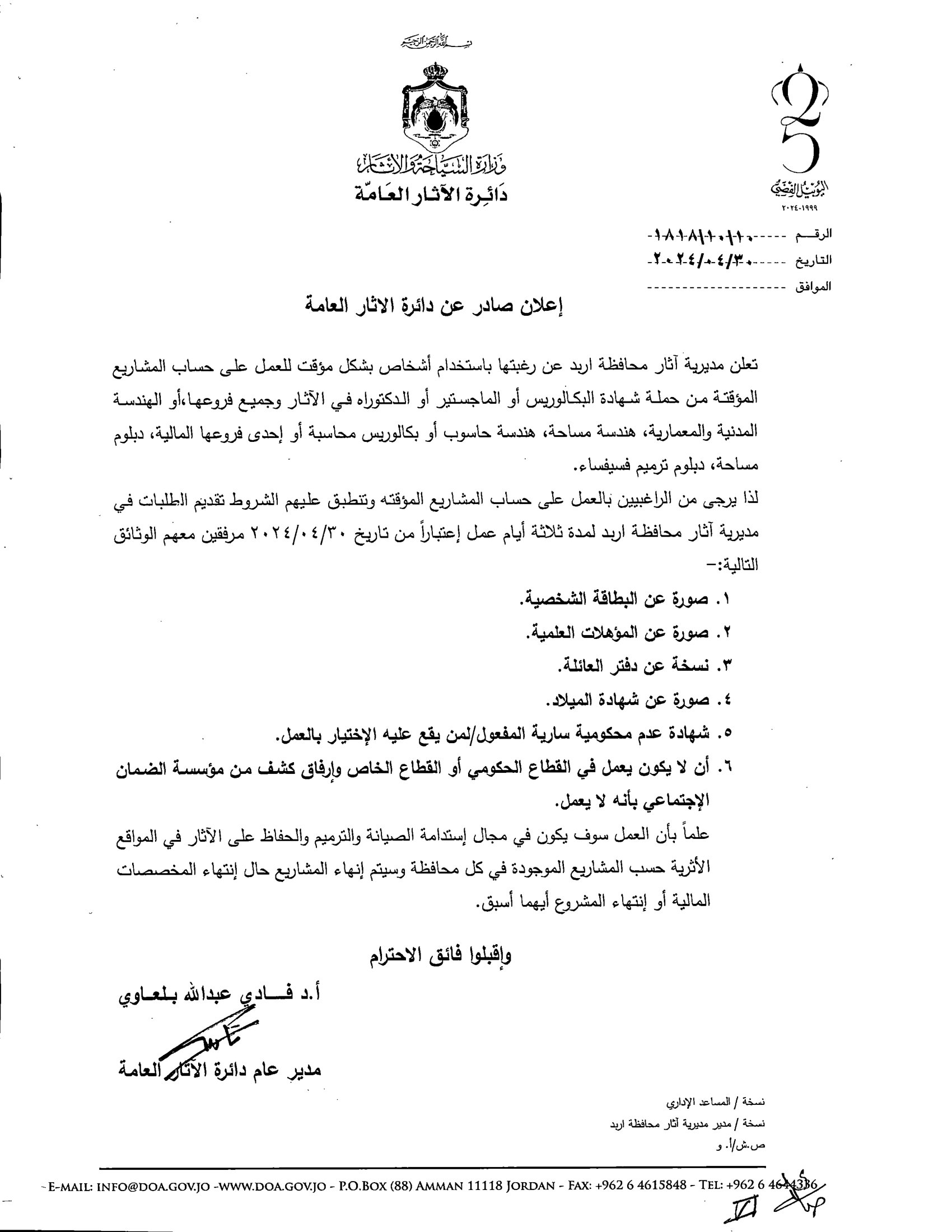 إعلان تشغيل لحساب المشاريع المؤقتة -مديرية اثار محافظة اربد