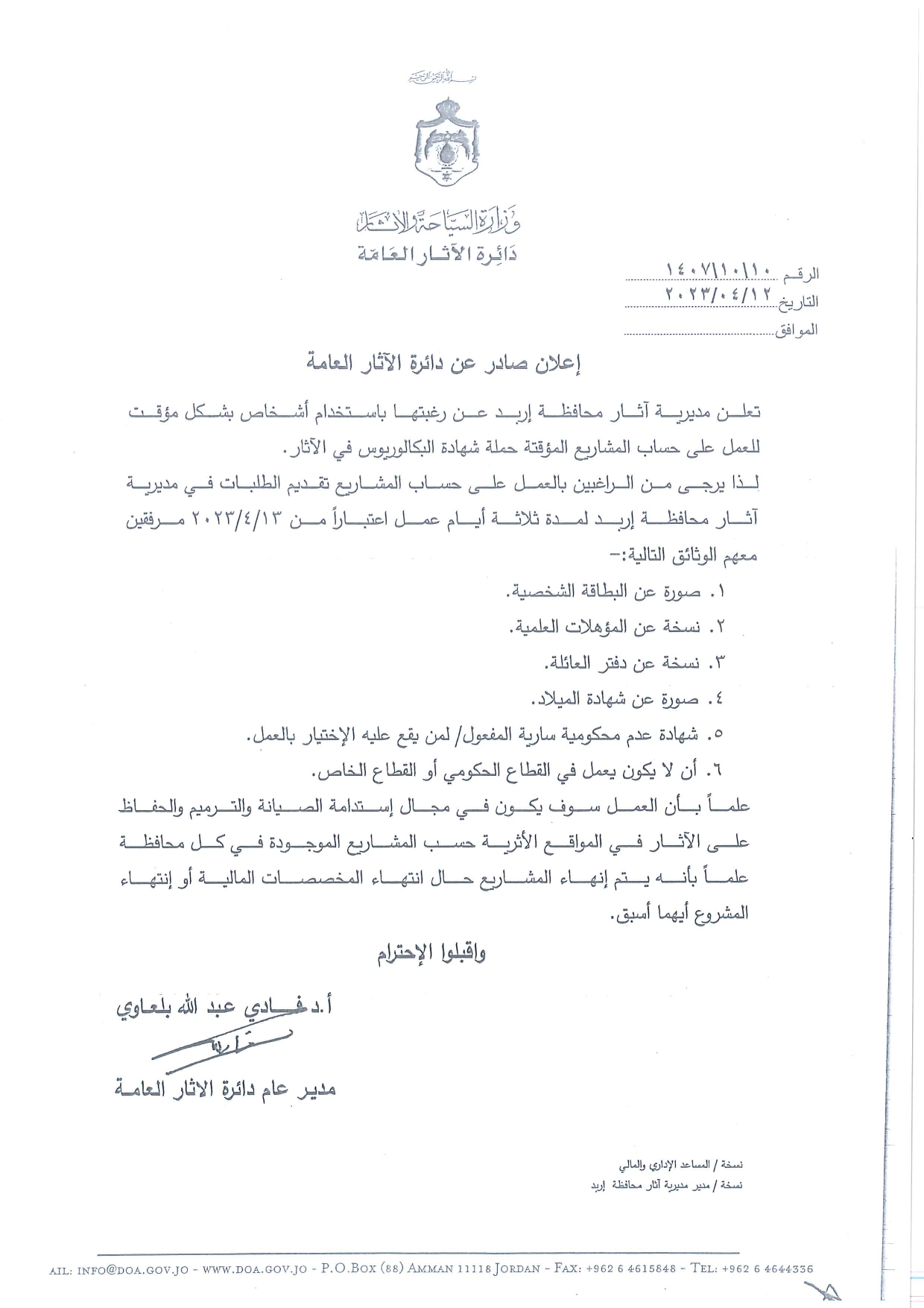 إعلان تشغيل لحساب المشاريع المؤقتة -مديرية اثار محافظة اربد
