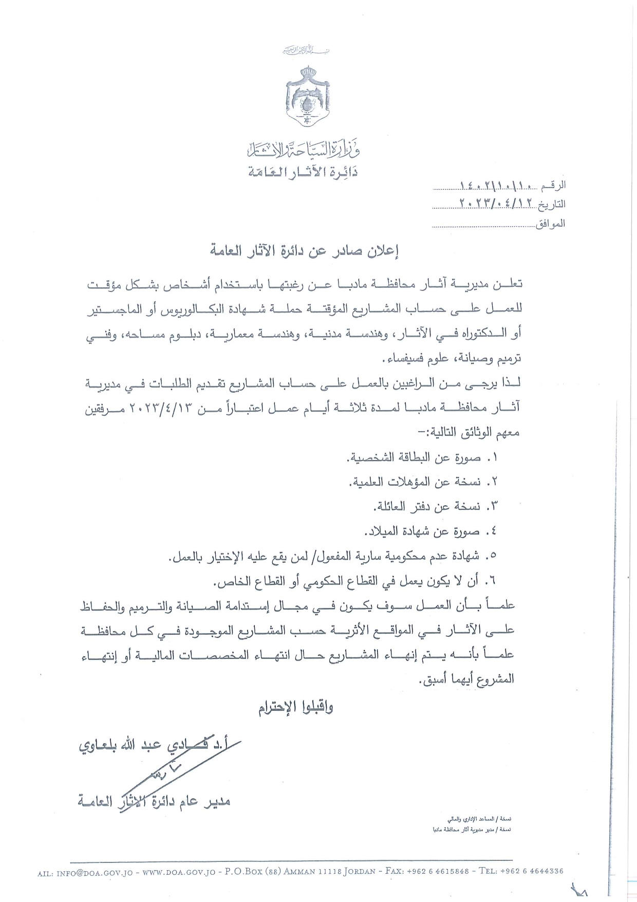 إعلان تشغيل لحساب المشاريع المؤقتة -مديرية اثار محافظة مادبا