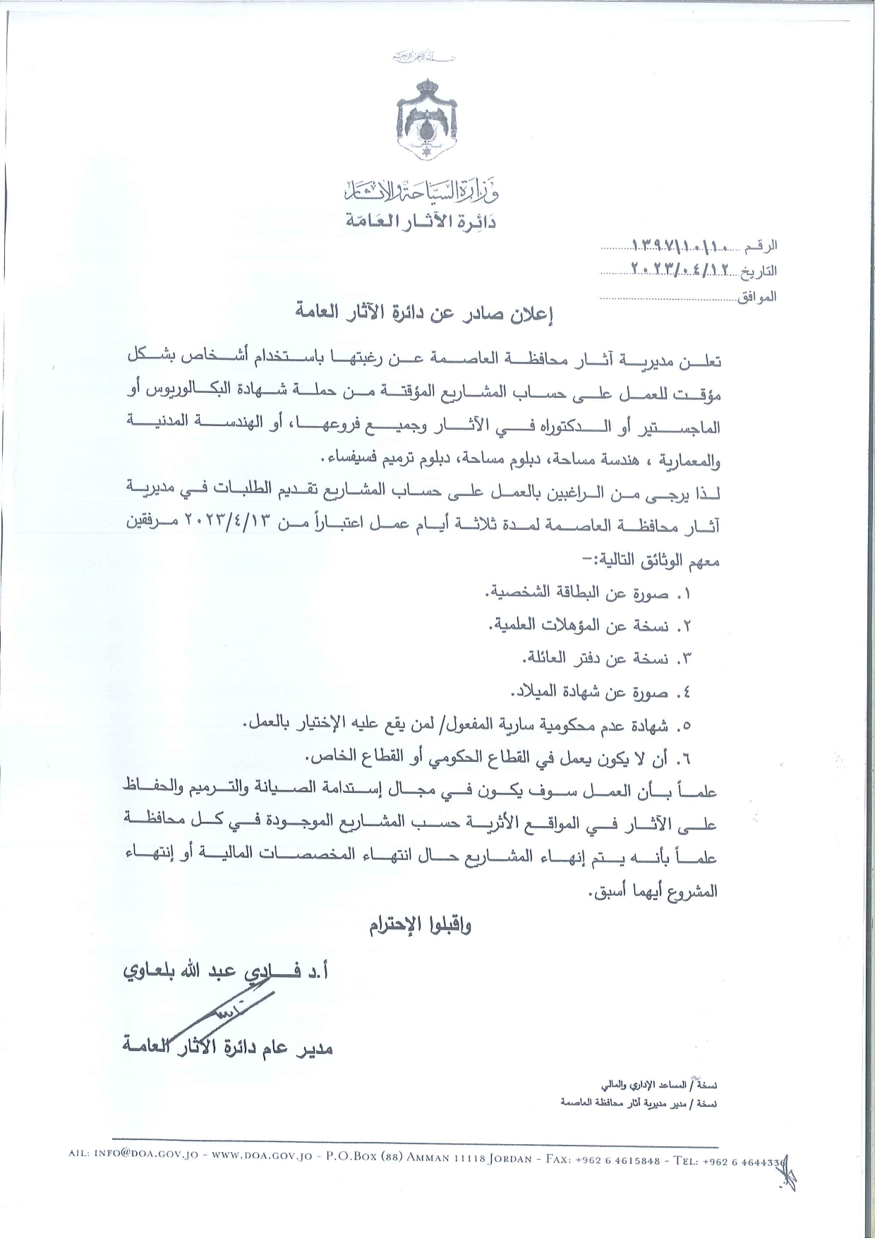 إعلان تشغيل لحساب المشاريع المؤقتة -مديرية اثار محافظة العاصمة