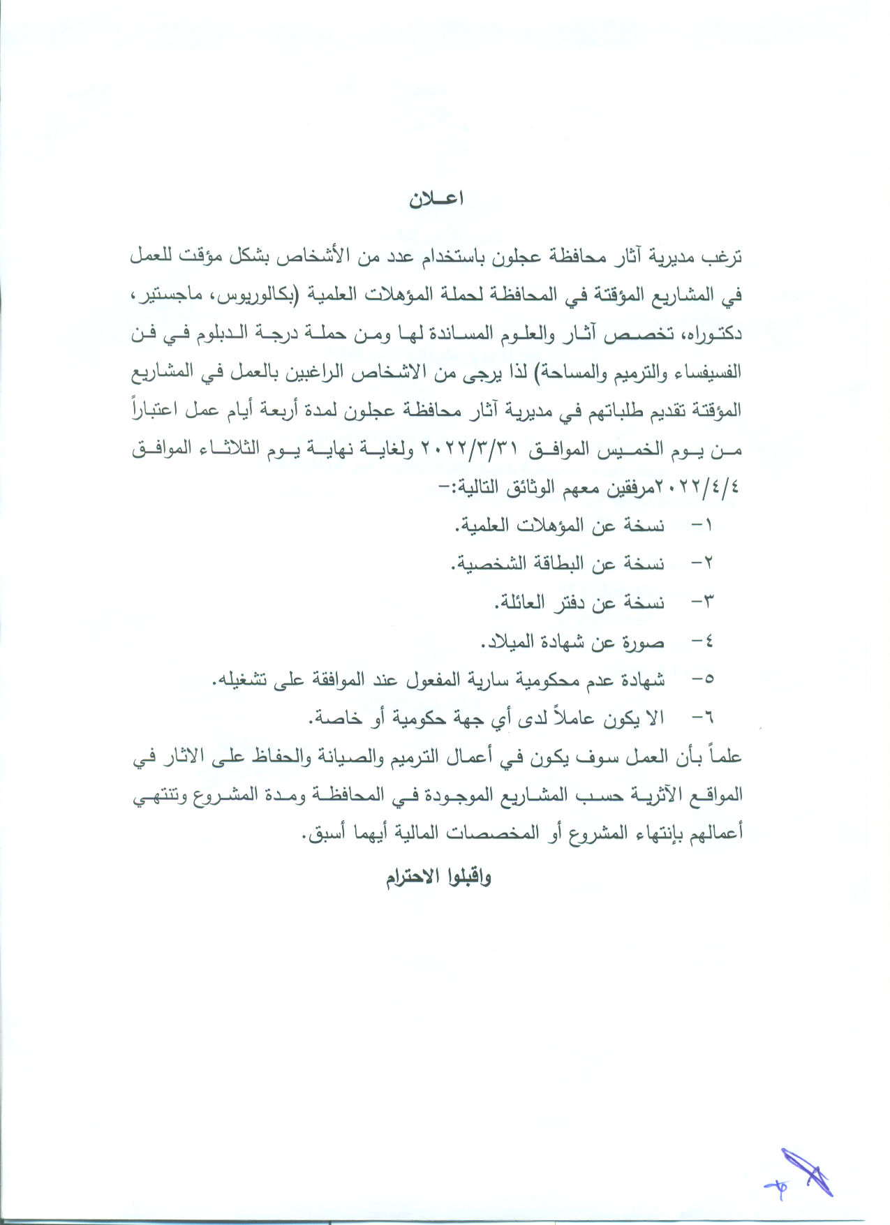 إعلان تشغيل لحساب المشاريع المؤقتة -مديرية اثار محافظة عجلون