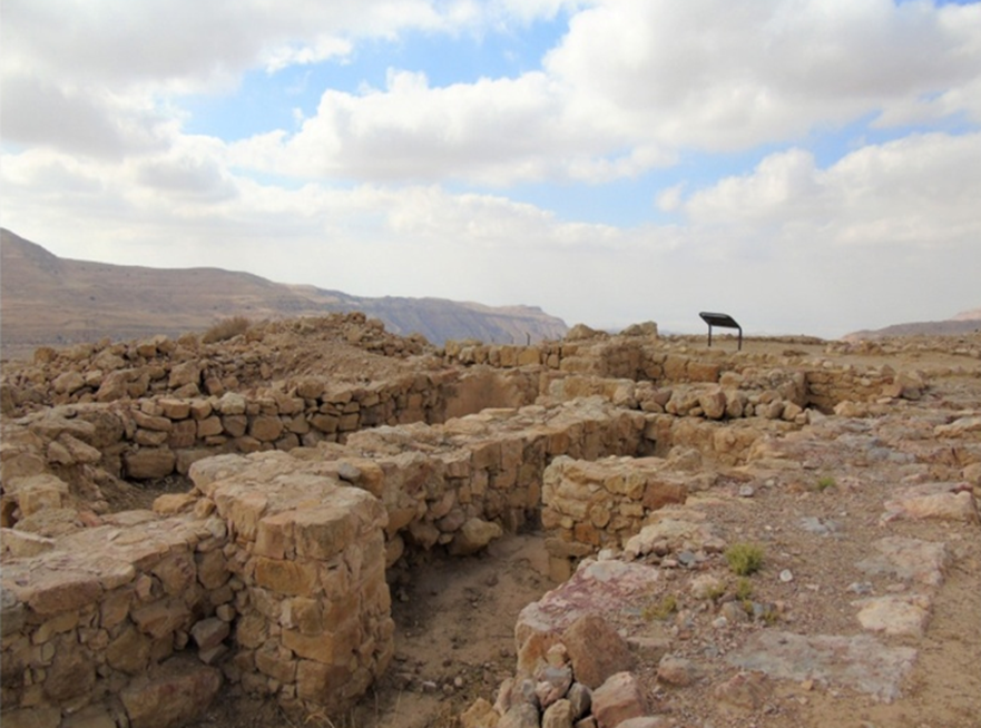 يحتوي الموقع على عدد كبير من البقايا المعمارية والتي تعود إلى فترات زمنية متعددة ( آدومي، روماني مبكر، بيزنطي وإسلامي متأخر) وقد كان نلسون جلوك أول من زار الموقع خلال مسوحاته عام 1933م ووصف معالمه وتحدث عن وجود معبد يعود للفترة النبطية.
