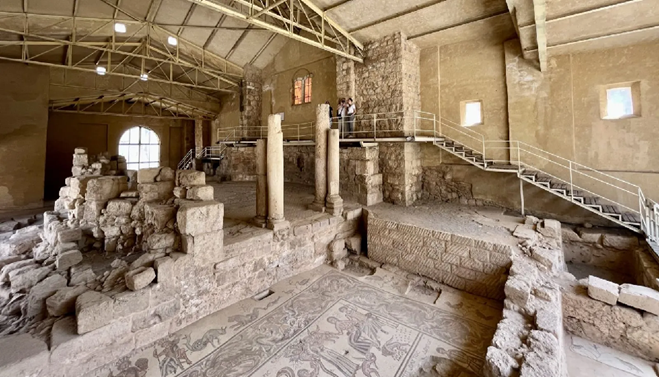 وأولى الحفريات الأثرية في الموقع كانت عام 1967 بإشراف المعهد الإنجيلي الألماني أدت هذه الحفريات إلى اكتشاف ملامح الكنيسة والتي بنيت على نظام البازليكا حيث يبلغ طولها حوالي 50.23م وعرضها 30 .15 م ولها ثلاث مداخل في الجهة الغربية من الكنيسة وأرضياتها مرصوفة بالفسيفساء في الصحن الأوسط توجد أجمل اللوحات الفسيفسائية على الإطلاق حيث يوجد في منتصف الصحن دائرة فيها تشخيص لإله البحر بالإضافة إلى اسم الشخص الذي قام بعمل هذه اللوحة و هو الفنان سلمانيوس.