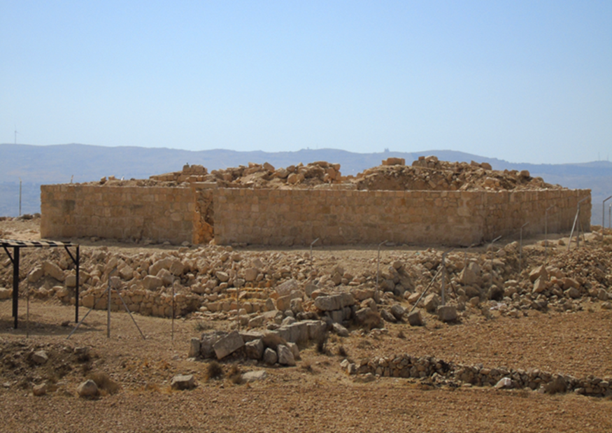 يحتوي الموقع على عدد كبير من البقايا المعمارية والتي تعود إلى فترات زمنية متعددة ( آدومي، روماني مبكر، بيزنطي وإسلامي متأخر) وقد كان نلسون جلوك أول من زار الموقع خلال مسوحاته عام 1933م ووصف معالمه وتحدث عن وجود معبد يعود للفترة النبطية.