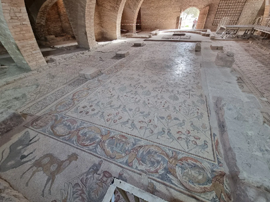وأرضية هذه الغرف مغطاة بالفسيفساء وهي تمثل أوراق الاكانتش يوجد بداخلها العديد من الحيوانات ومشاهد الصيد مع صورة لامرأة وربما يكون تشخيص للأرض ومحاط بإطار عريض من رسوم نباتية وأسماك وطيور .