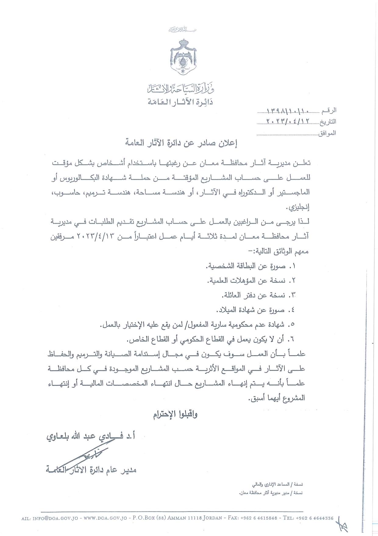 إعلان تشغيل لحساب المشاريع المؤقتة -مديرية اثار محافظة معان