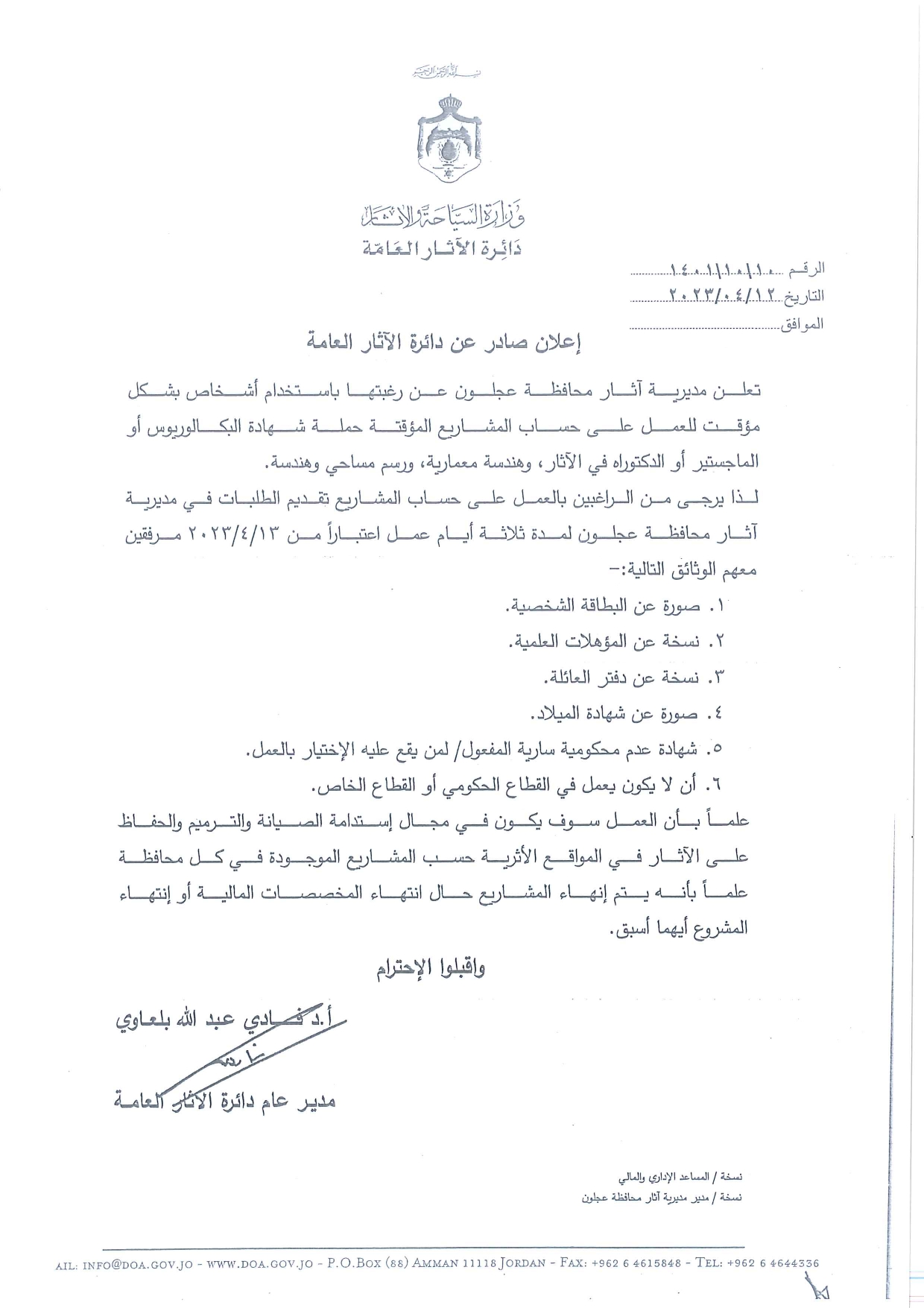 إعلان تشغيل لحساب المشاريع المؤقتة -مديرية اثار محافظة عجلون