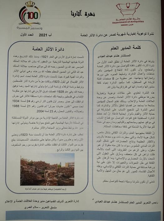 صدرت دائرة الآثار العامة/ وحدة العلاقات العامة والإعلام، العدد الأول لنشرتها التوعوية الشهرية " آثارنا" لشهر آب، بصورتها الورقية والإلكترونية.
