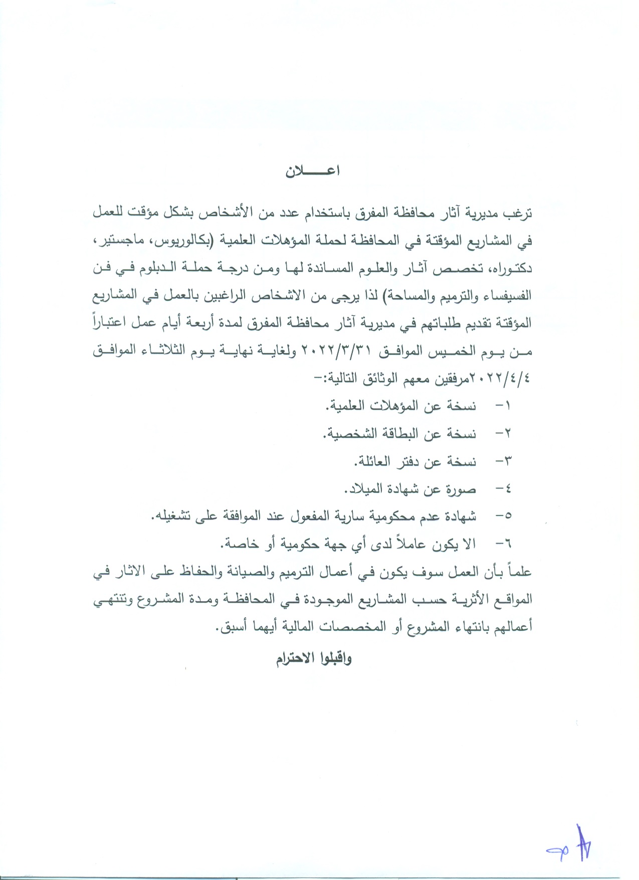 إعلان تشغيل لحساب المشاريع المؤقتة -مديرية اثار محافظة المفرق