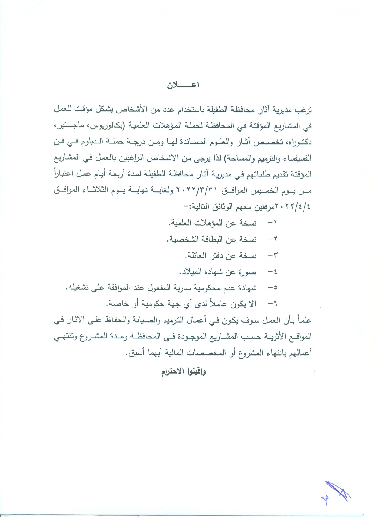 إعلان تشغيل لحساب المشاريع المؤقتة -مديرية اثار محافظة الطفيلة