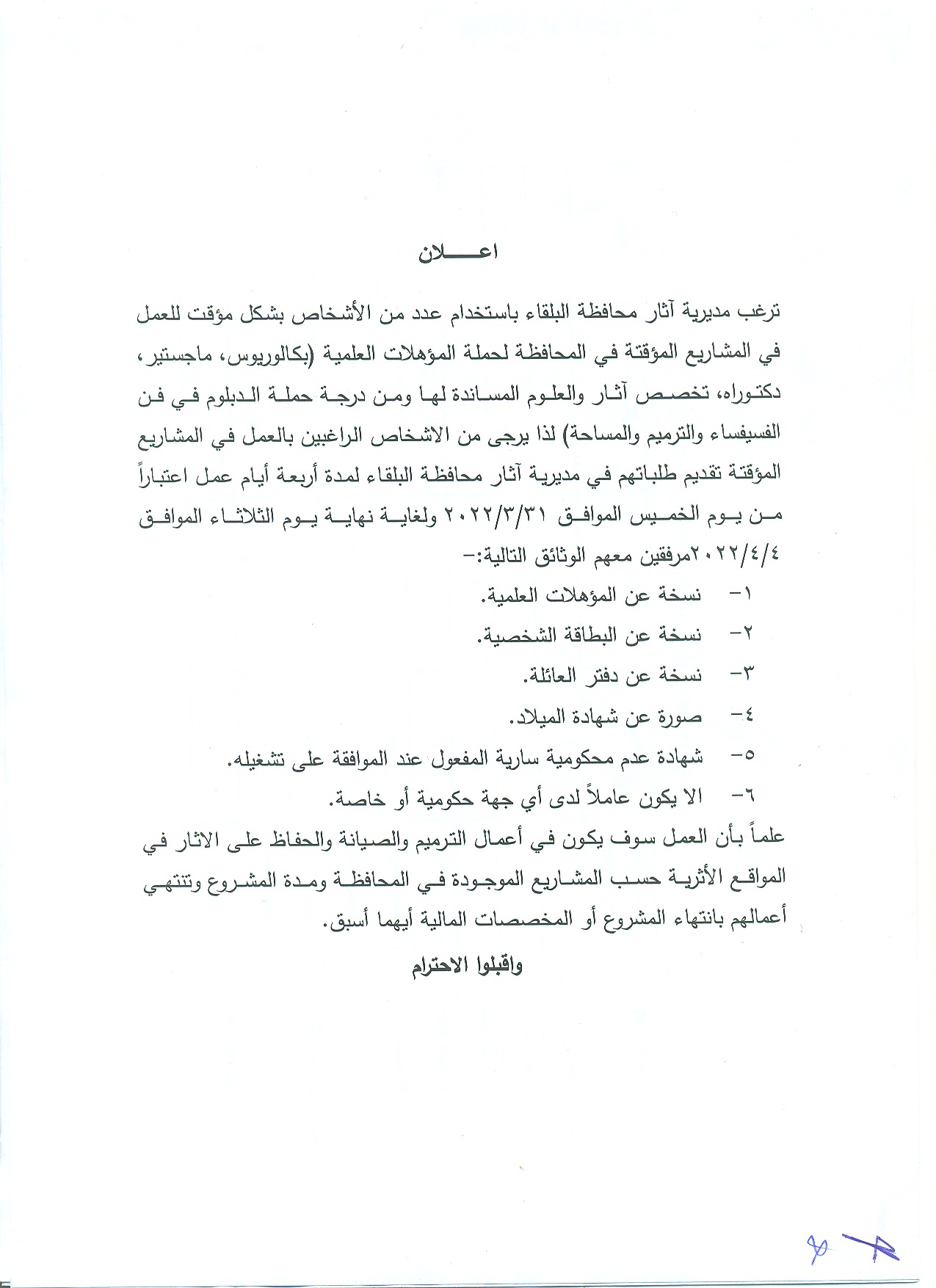 إعلان تشغيل لحساب المشاريع المؤقتة -مديرية اثار محافظة البلقاء